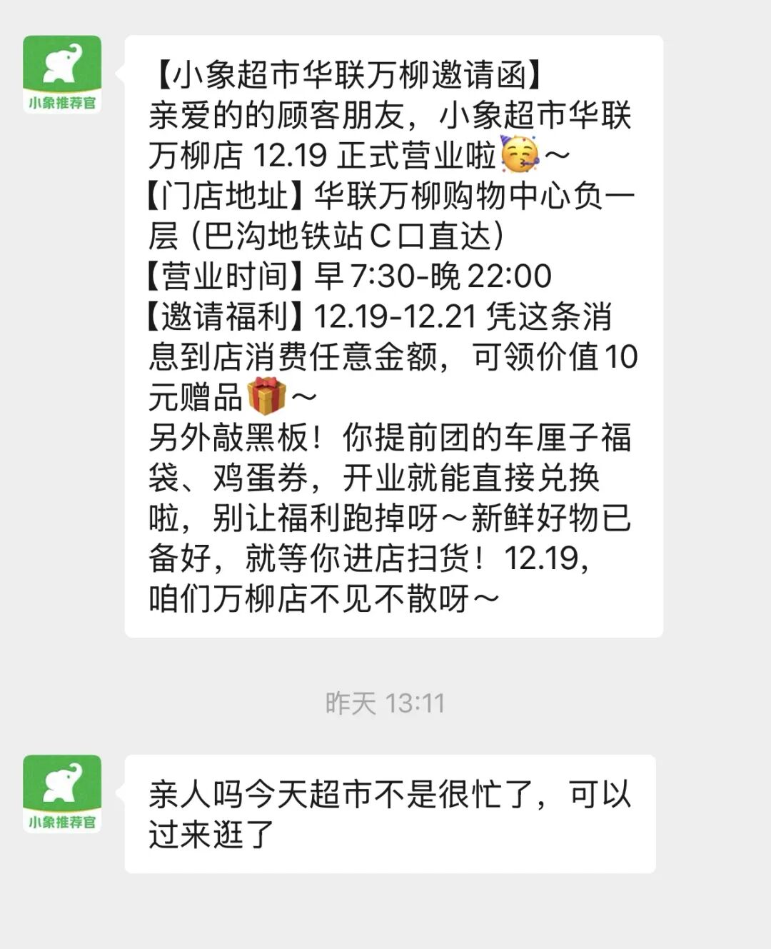 开业后的第四天,也就是12月23日,我收到了小象超市地推人员群发的消息:“亲人们,今天超市不是很忙了,可以过来逛了……”